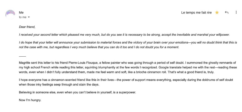 THE POWER OF SUPPORT ☁️ Posted on March 25, 2020August 1, 2024 by Mischa Downing LA CORDE SENSIBLE, René Magritte (1960) Share this: Click to share on X (Opens in new window) X Click to share on Facebook (Opens in new window) Facebook Like Loading...